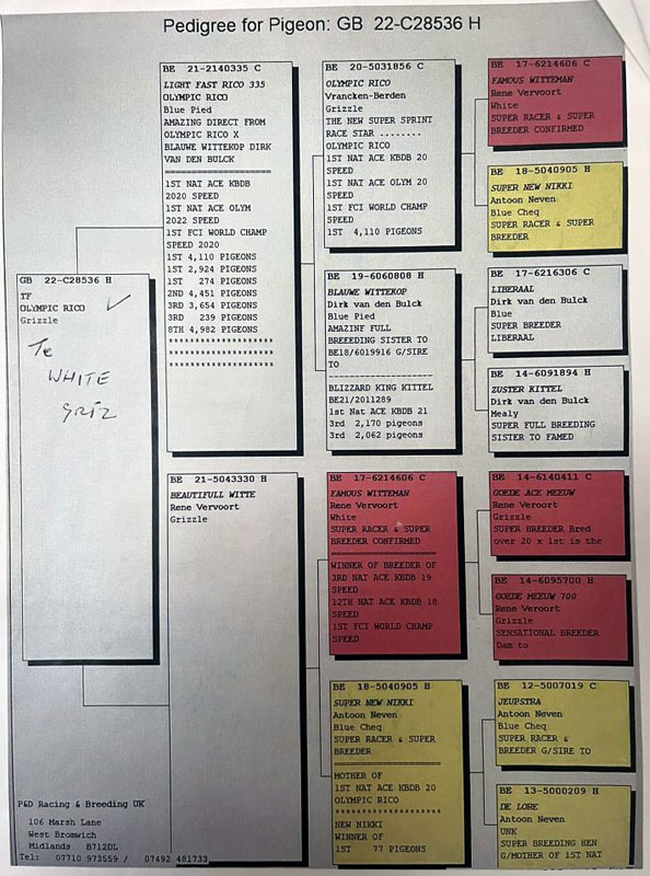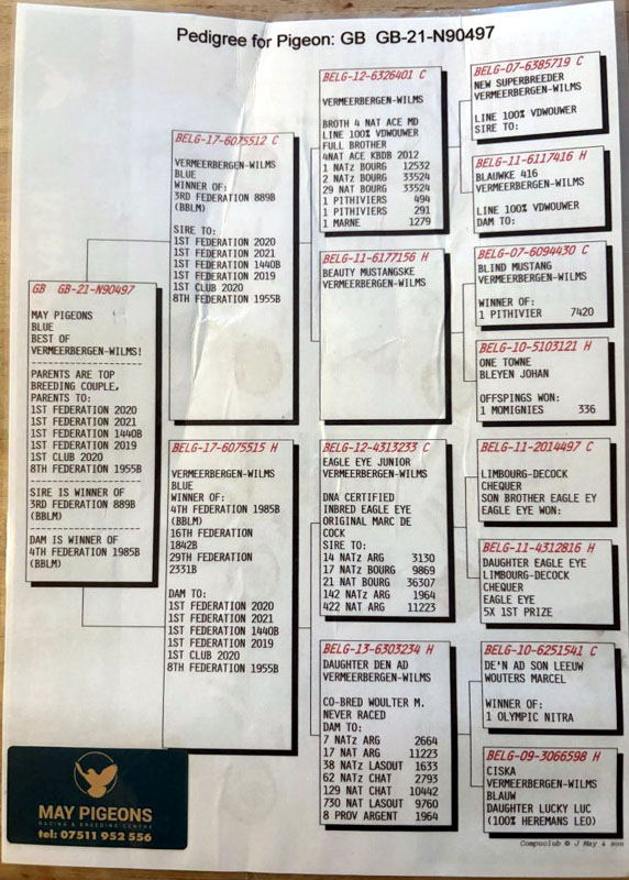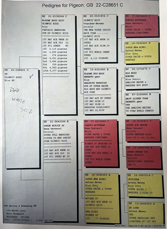 This bird is with Chris Calvert. Vermeerbergen x Olympic Rico. Pedigrees are of sire and of parents to dam.