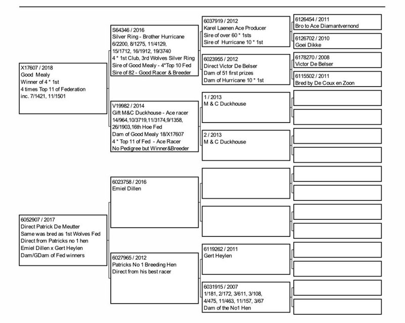 This bird is with Chris Calvert. Sire is Van Den Bulk Fenech Lines. Dam is Owen Joesbury & Son. Pedigree is of dam.
