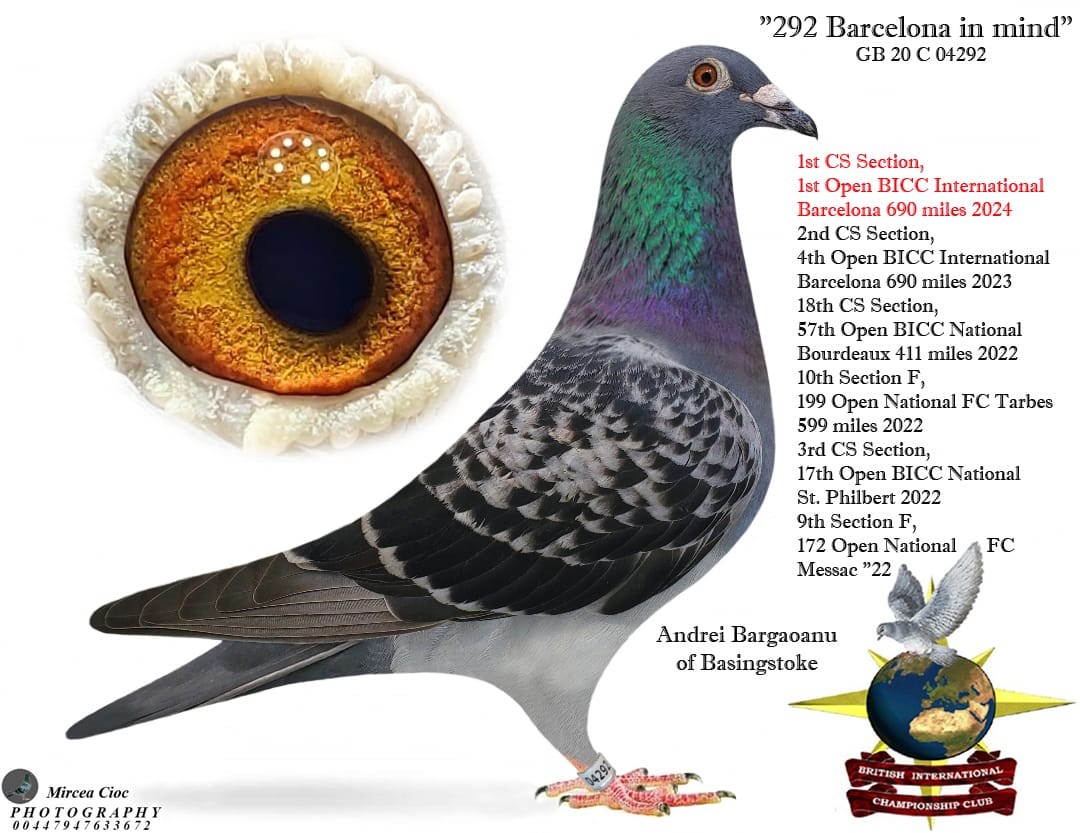 A 2026 grandchild from my 292 Hen, 1st Open Barcelona, and 4th Barcelona. The winner can choose from any bred from this bird.