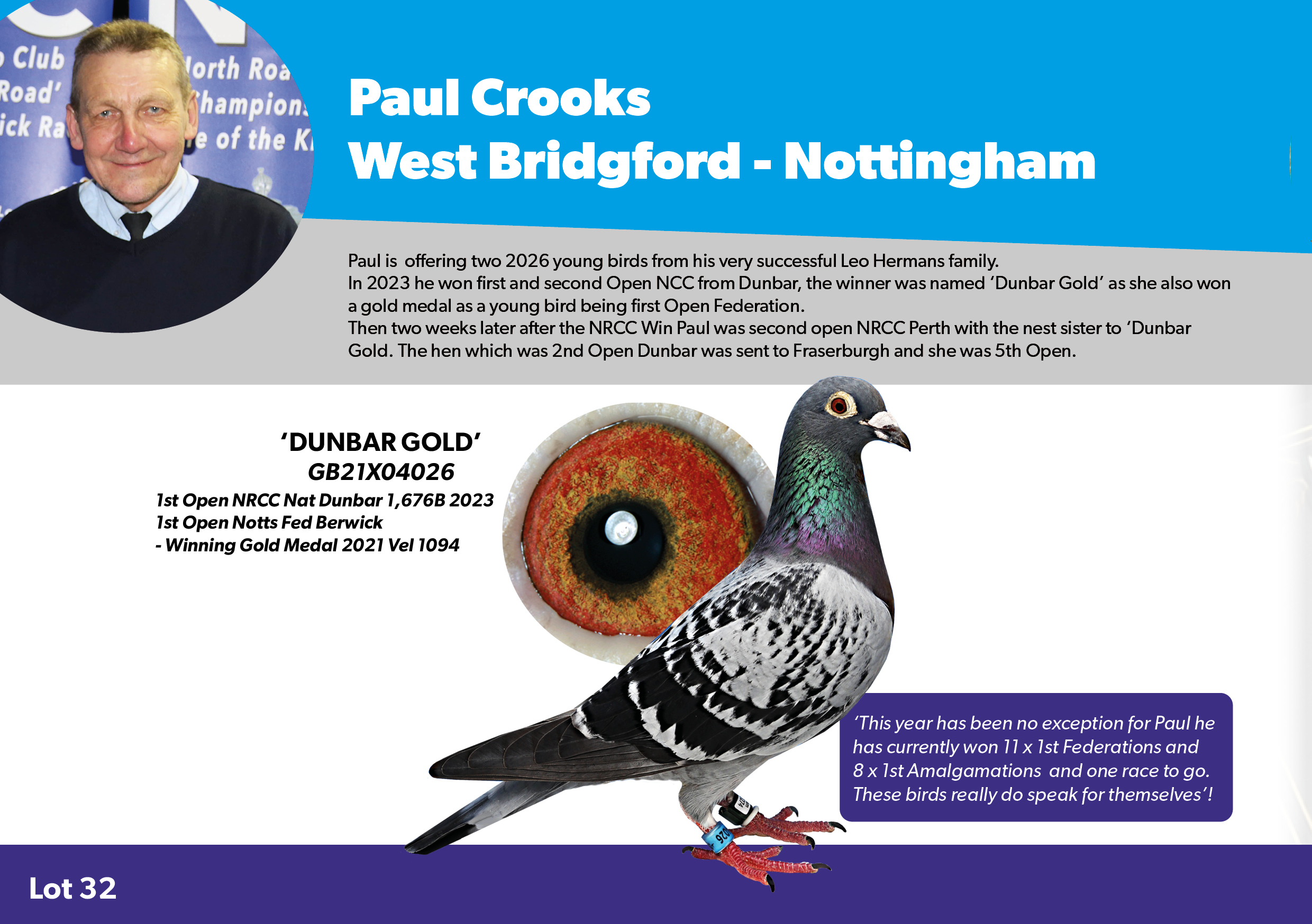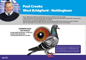 This year Paul has won 11 x 1st Federations and 8 x 1st Amalgamations and one race to go. Paul has donated two 2026 young birds from his very successful Leo Hermans family.