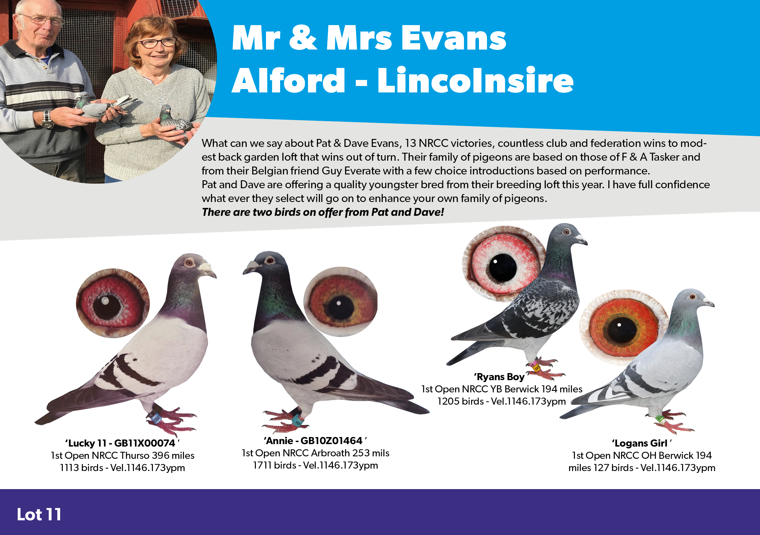 What can we say about Pat & Dave Evans, 13 NRCC victories, countless club and federation wins to modest back garden loft that wins out of turn. Their family of pigeons are based on those of F & A Tasker and from their Belgian friend Guy Everate with a few choice introductions based on performance.