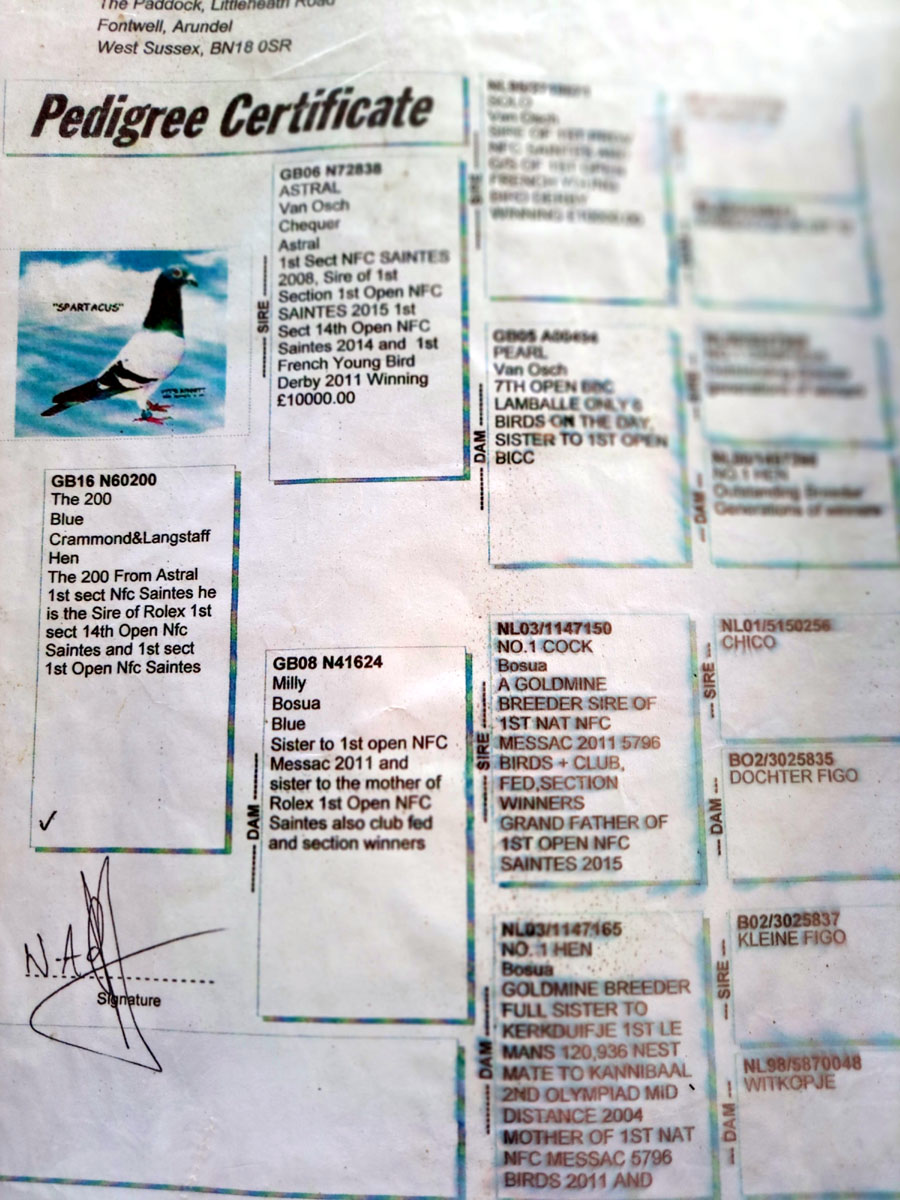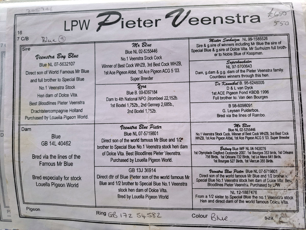 Sire – GSire Veenstra Boy Blue, Direct son of World Famous Mr Blue and full brother to Special Blue. No 1 Veenstra Stock. Hen Dam of Dolce Vita. Best Vloodlines Pieter Veenstra Drachtstercompagnie Holland Purchased by Louella Pigeon World.